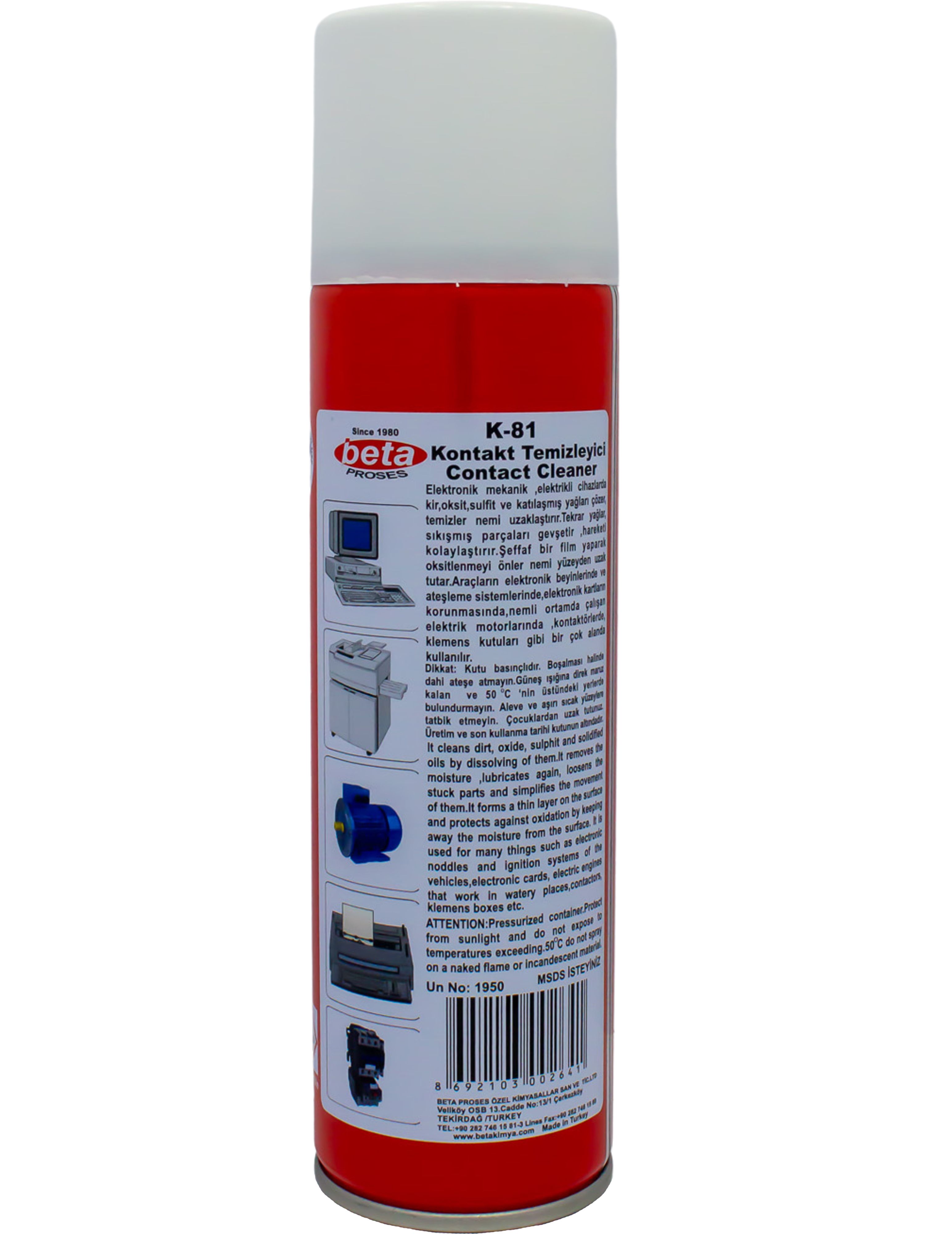 It cleans dirt, oxides, sulphites, and solidified oils by dissolving them. It removes moisture, re-lubricates, loosens stuck parts, and simplifies their movement. It forms a thin layer on the surface to protect against oxidation and keeps moisture away. It is used for many applications such as electronic modules, ignition systems of vehicles, electronic cards, electric engines that operate in wet environments, contactors, and terminal boxes. It does not damage the applying surface. It does not contain harmful materials for human health and the environment.