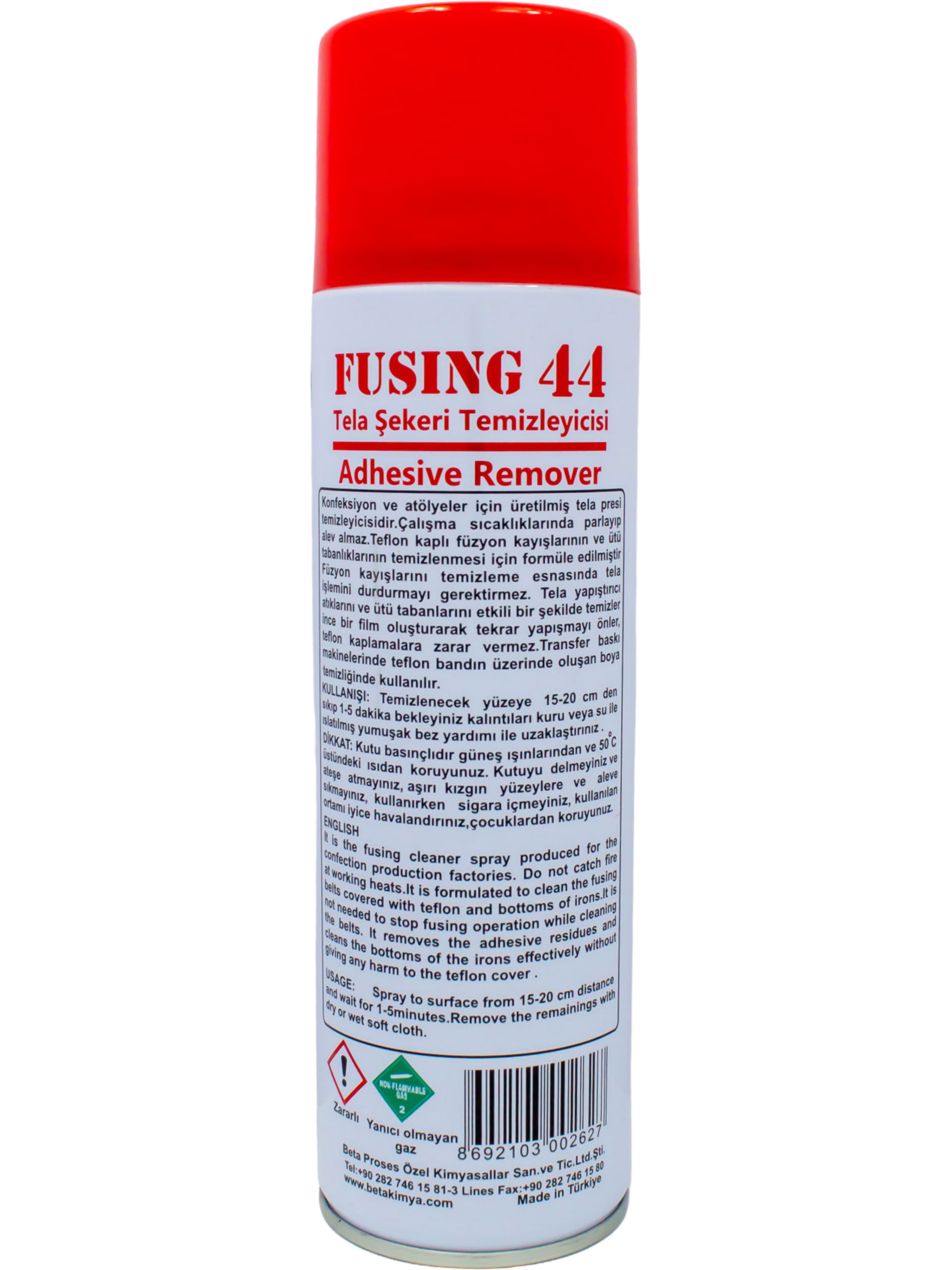 It is a fusing cleaner spray produced for confection production factories. It does not catch fire at working temperatures. It is formulated to clean the fusing belts covered with Teflon and the bottoms of irons. It is not necessary to stop the fusing operation while cleaning the belts. It removes adhesive residues and cleans the bottoms of the irons effectively without harming the Teflon coating. It is presented in 500 ml economic cans for industrial usage.