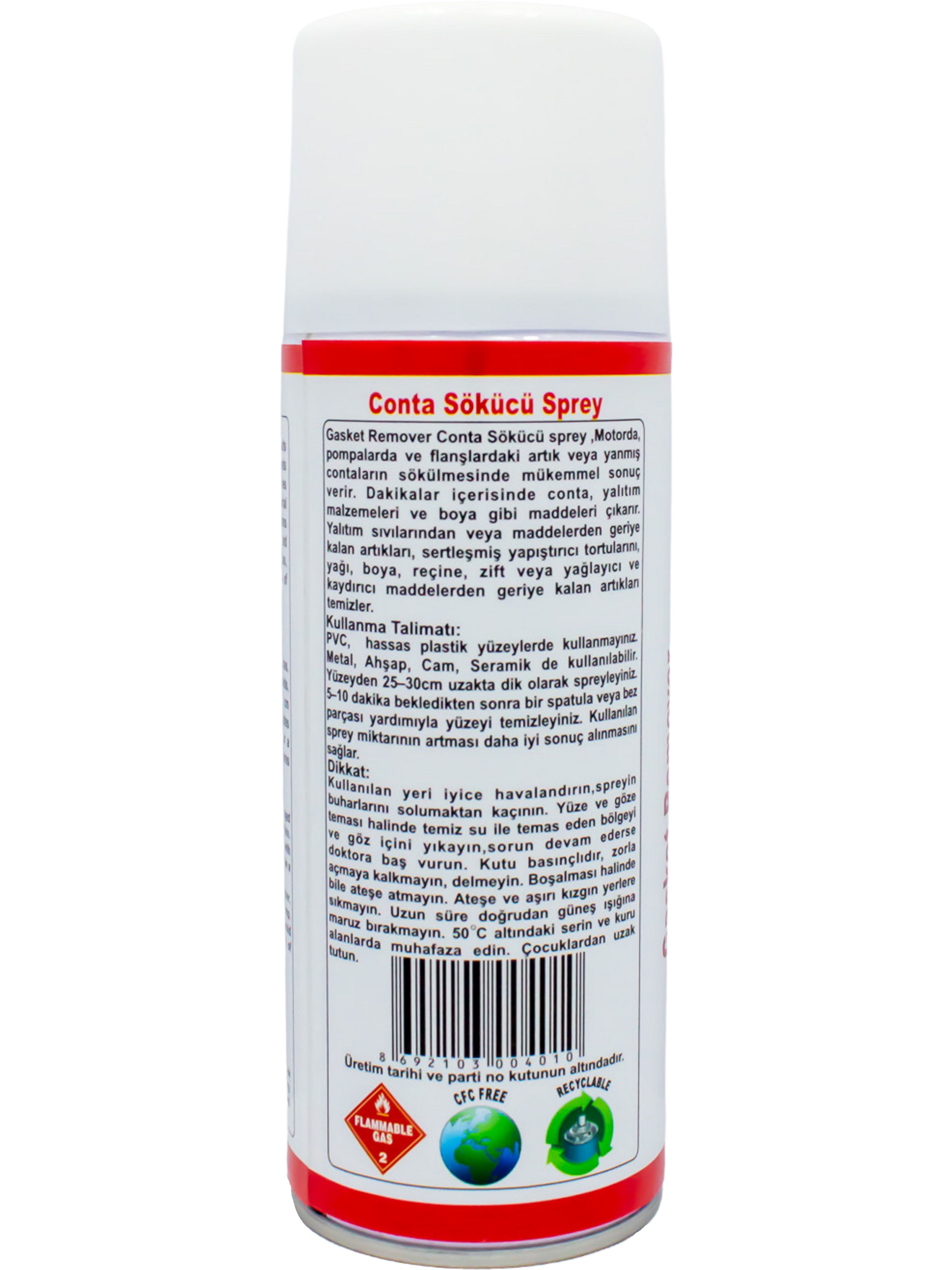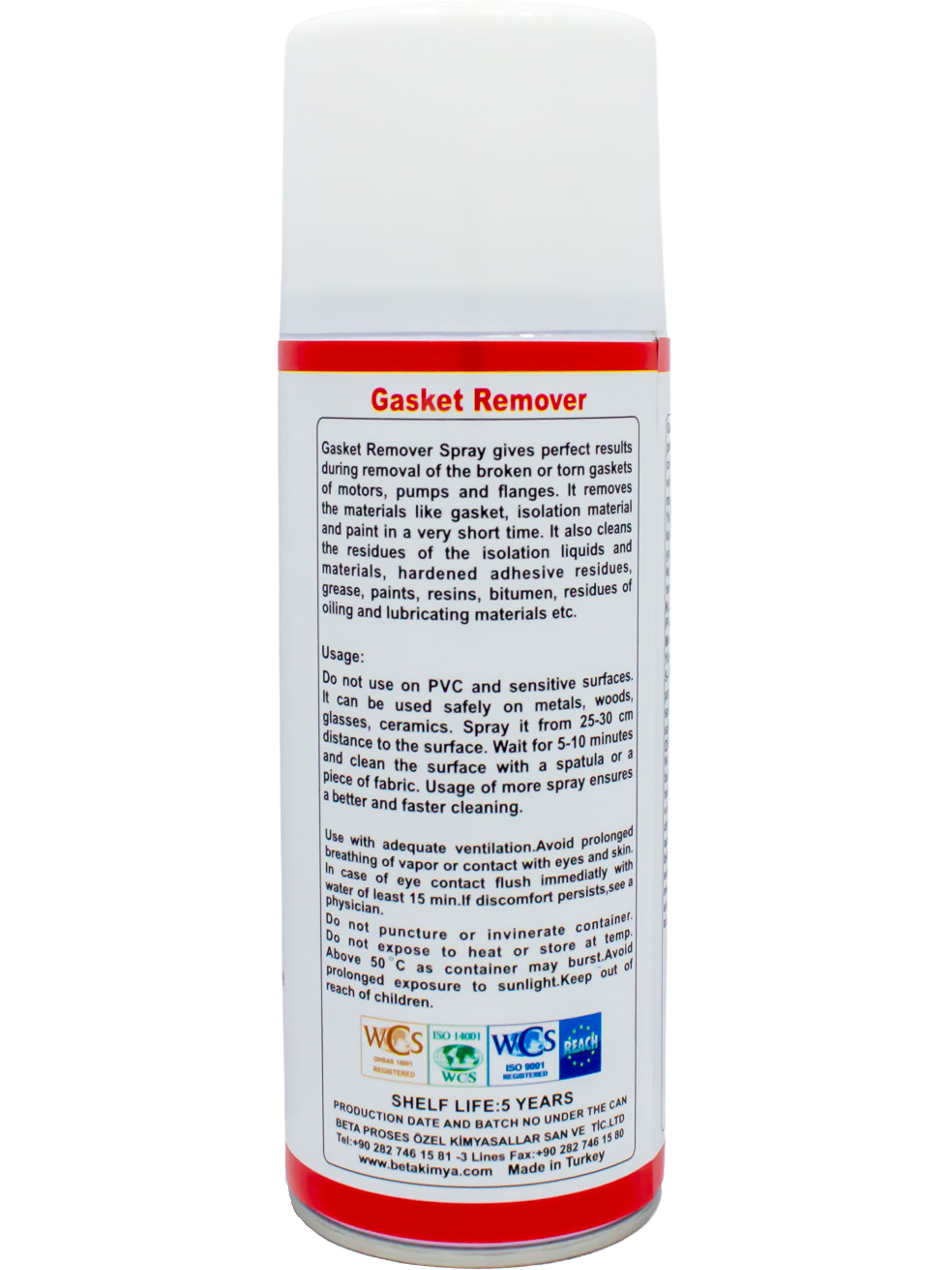 Gasket Remover Conta Sökücü sprey, motorda, pompalarda ve flanşlardaki artık veya yanmış contaların sökülmesinde mükemmel sonuç verir. Dakikalar içerisinde conta, yalıtım malzemeleri ve boya gibi maddeleri çıkarır. Yalıtım sıvılarından veya maddelerden geriye kalan artıkları, sertleşmiş yapıştırıcı tortularını, yağı, boya, reçine, zift veya yağlayıcı ve kaydırıcı maddelerden geriye kalan artıkları temizler.