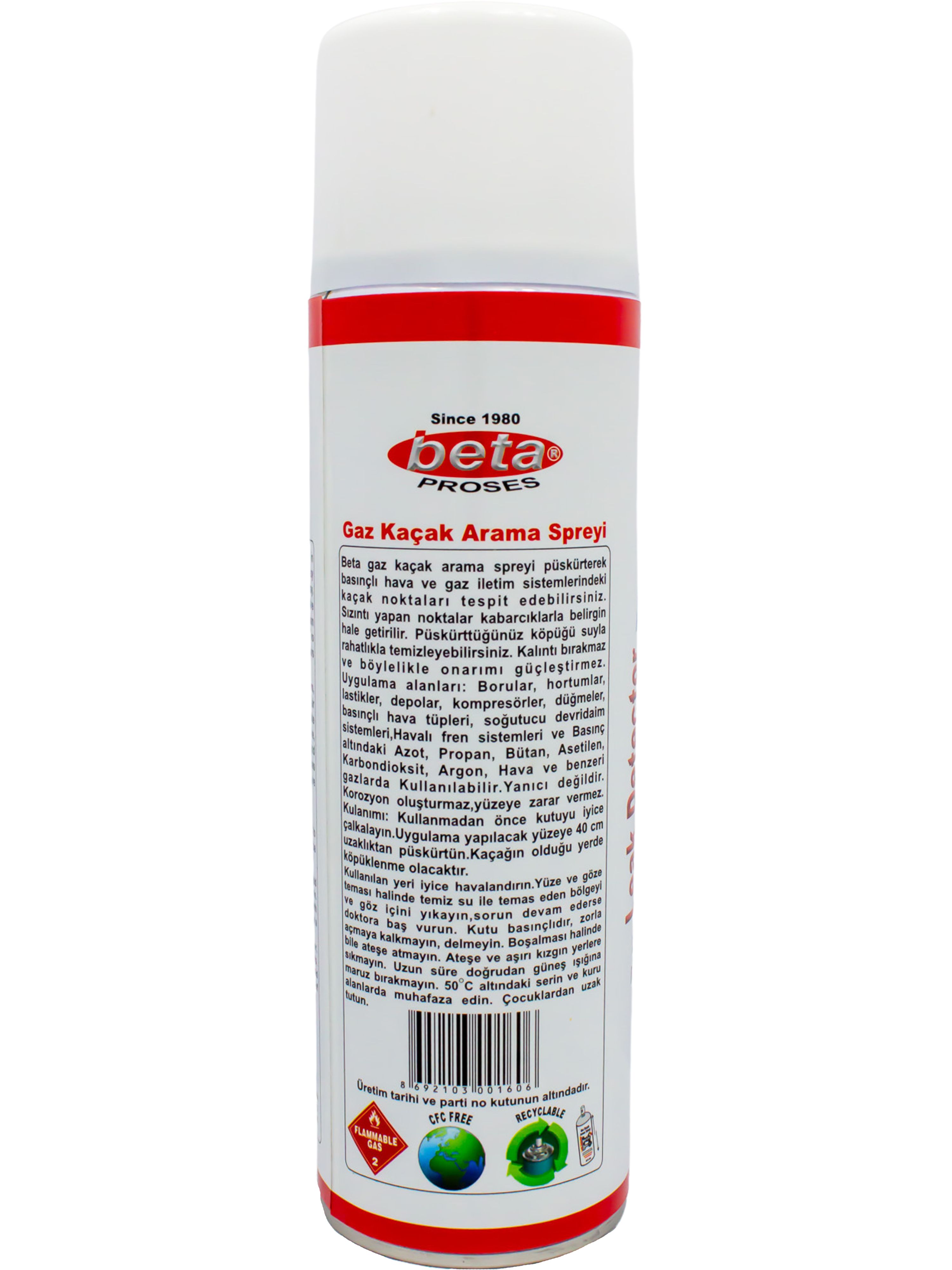 Beta gaz kaçak arama spreyini püskürterek basınçlı hava ve gaz iletim sistemlerindeki kaçak noktalarını tespit edebilirsiniz. Sızıntı yapan noktalar kabarcıklarla belirgin hale gelir. Püskürttüğünüz köpüğü suyla rahatlıkla temizleyebilirsiniz. Artık bırakmaz ve böylelikle onarımı güçleştirmez. Uygulama alanları: Borular, hortumlar, lastikler, depolar, kompresörler, düğmeler, basınçlı hava tüpleri, soğutucu devre sistemleri, havalı fren sistemleri ve basınç altındaki azot, propan, bütan, asetilen, karbondioksit, argon, hava ve benzer gazlarda kullanılabilir. Yanıcı değildir. Korozyon oluşturmaz, yüzeye zarar vermez.