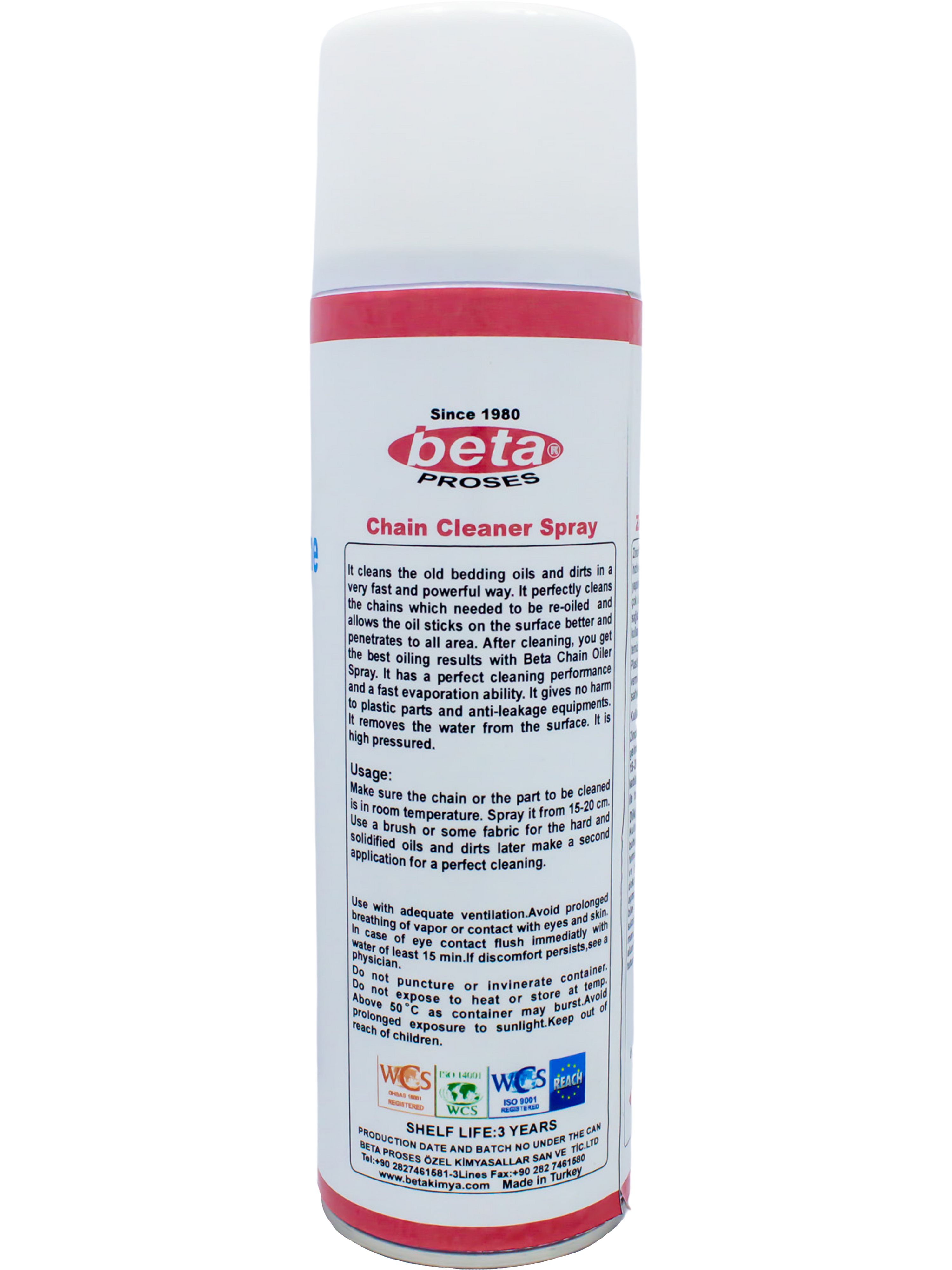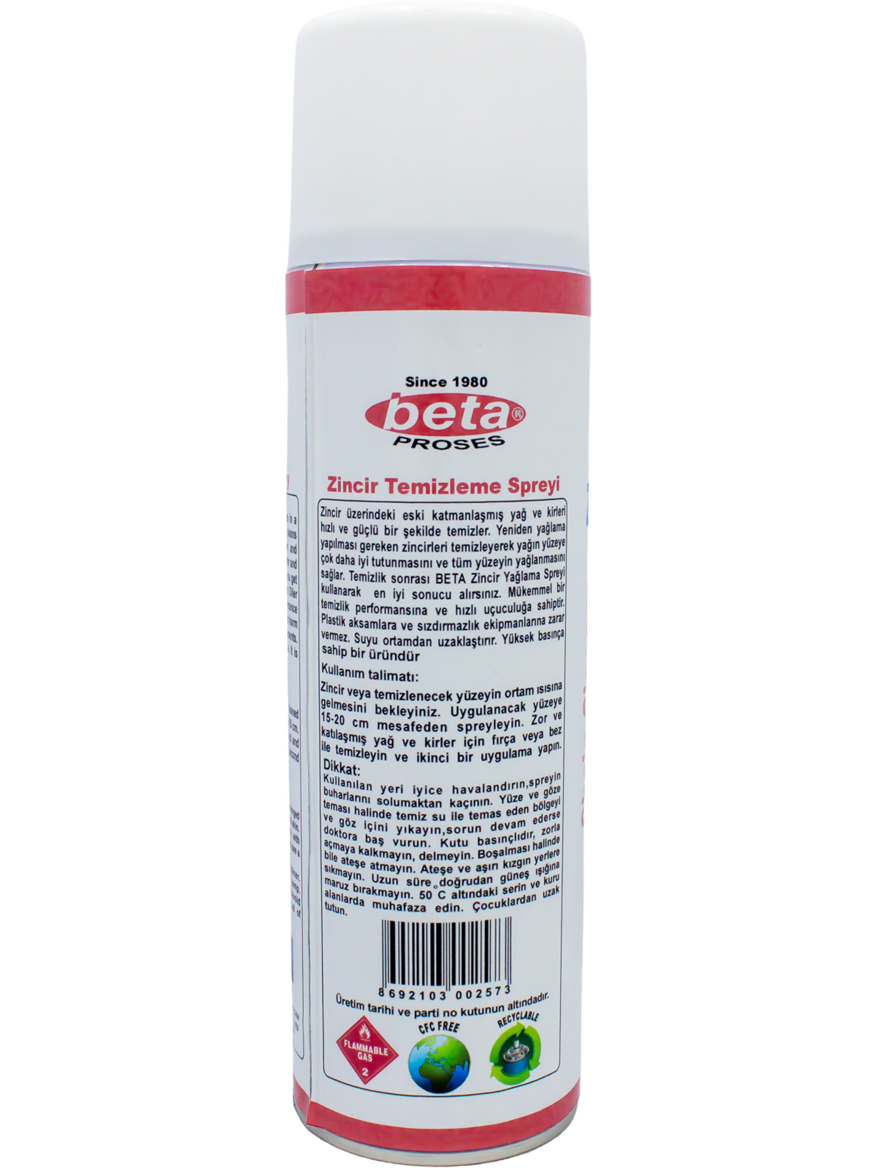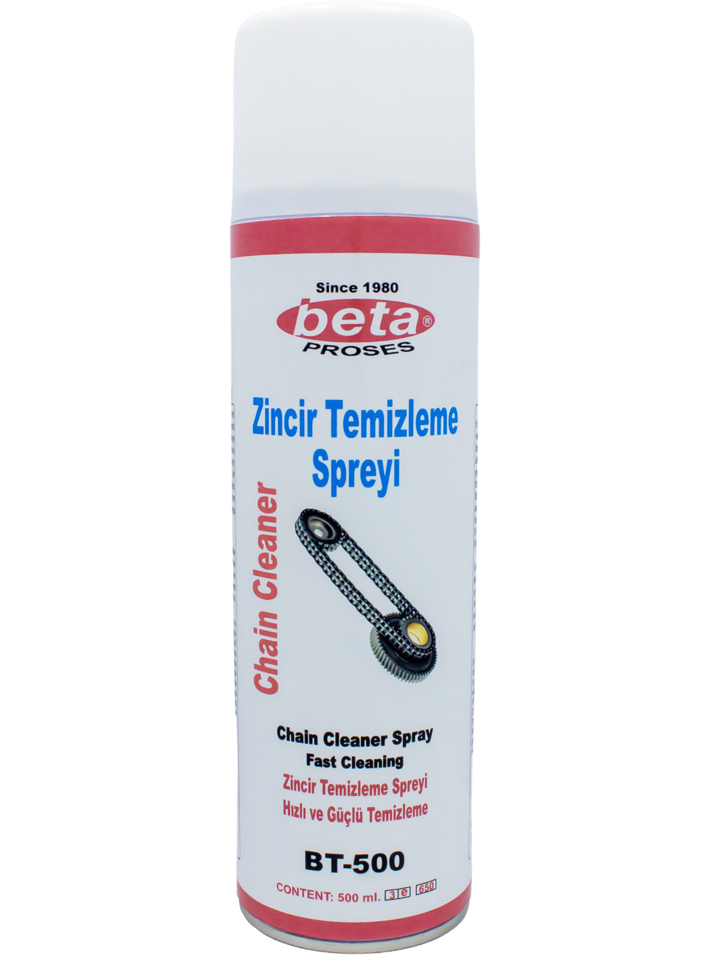 Zincir üzerindeki eski katmanlaşmış yağ ve kirleri hızlı ve güçlü bir şekilde temizler. Yeniden yağlama yapılması gereken zincirleri temizleyerek yağın yüzeye çok daha iyi tutunmasını ve tüm yüzeyin yağlanmasını sağlar. Temizlik sonrası en iyi sonucu almak için BETA Zincir Yağlama Spreyi kullanmanız önerilir. Mükemmel bir temizlik performansına ve hızlı uçuculuğa sahiptir. Plastik aksamlara ve sızdırmazlık ekipmanlarına zarar vermez. Suyu ortamdan uzaklaştırır. Yüksek basınca sahip bir üründür.