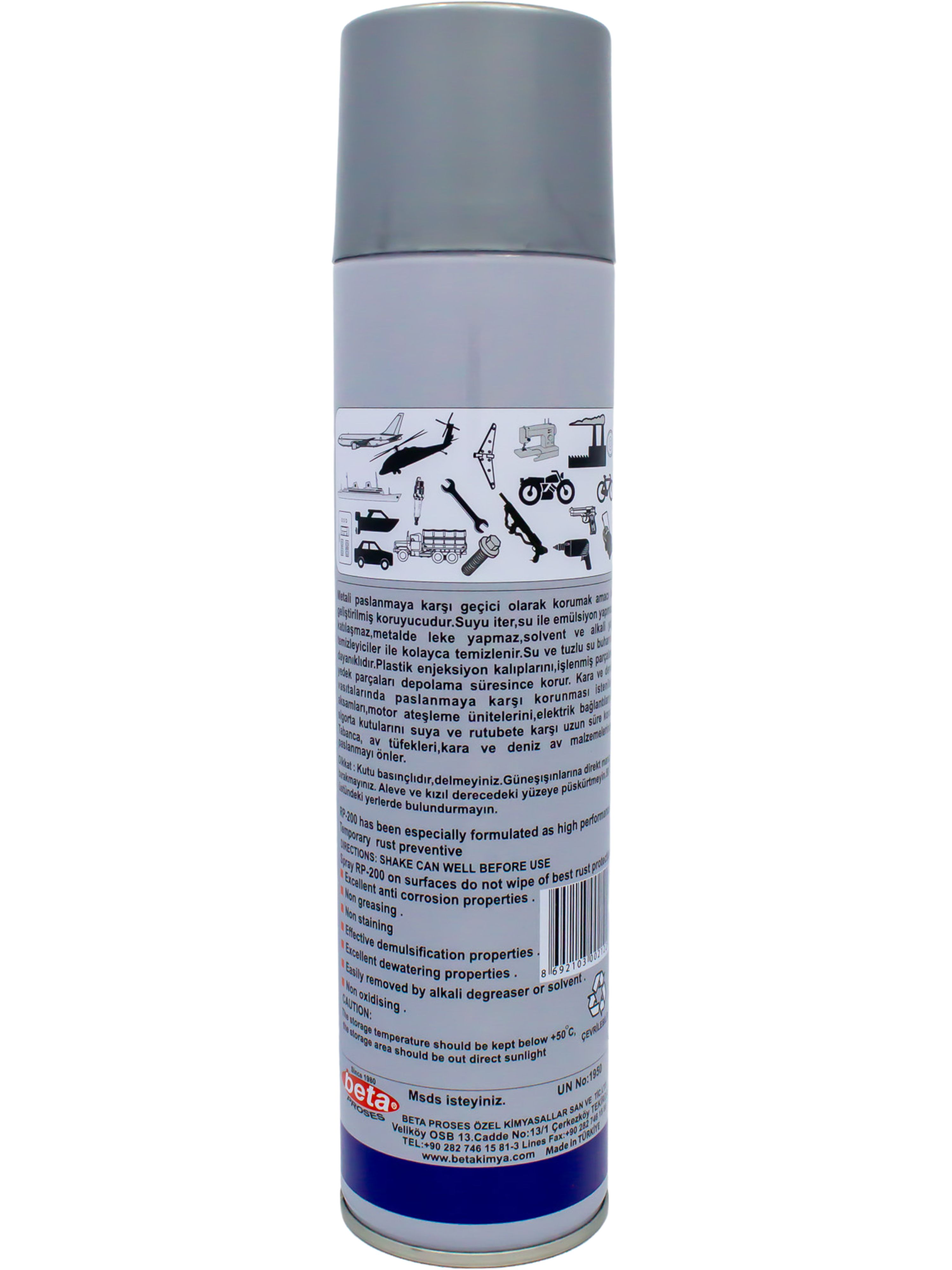 Metal paslanmaya karşı geçici olarak korumak amacıyla geliştirilmiş koruyucudur. Suyu iter, suyla emülsiyon yapmaz, katılaşmaz, metalde leke yapmaz ve solvent ile alkal yağ temizleyicilerle kolayca temizlenir. Su ve tuzlu su buharına dayanıklıdır. Plastik enjeksiyon kalıplarını, işlenmiş parçaları, yedek parçaları depolama süresince korur. Kara ve deniz araçlarında paslanmaya karşı korunması gereken aksamları, motor ateşleme ünitelerini, elektrik bağlantılarını, sigorta kutularını suya ve rutubete karşı uzun süre korur. Tabanca, av tüfekleri, kara ve deniz av malzemelerinde paslanmayı önler. İnsan sağlığına ve doğaya zararlı maddeler içermez.