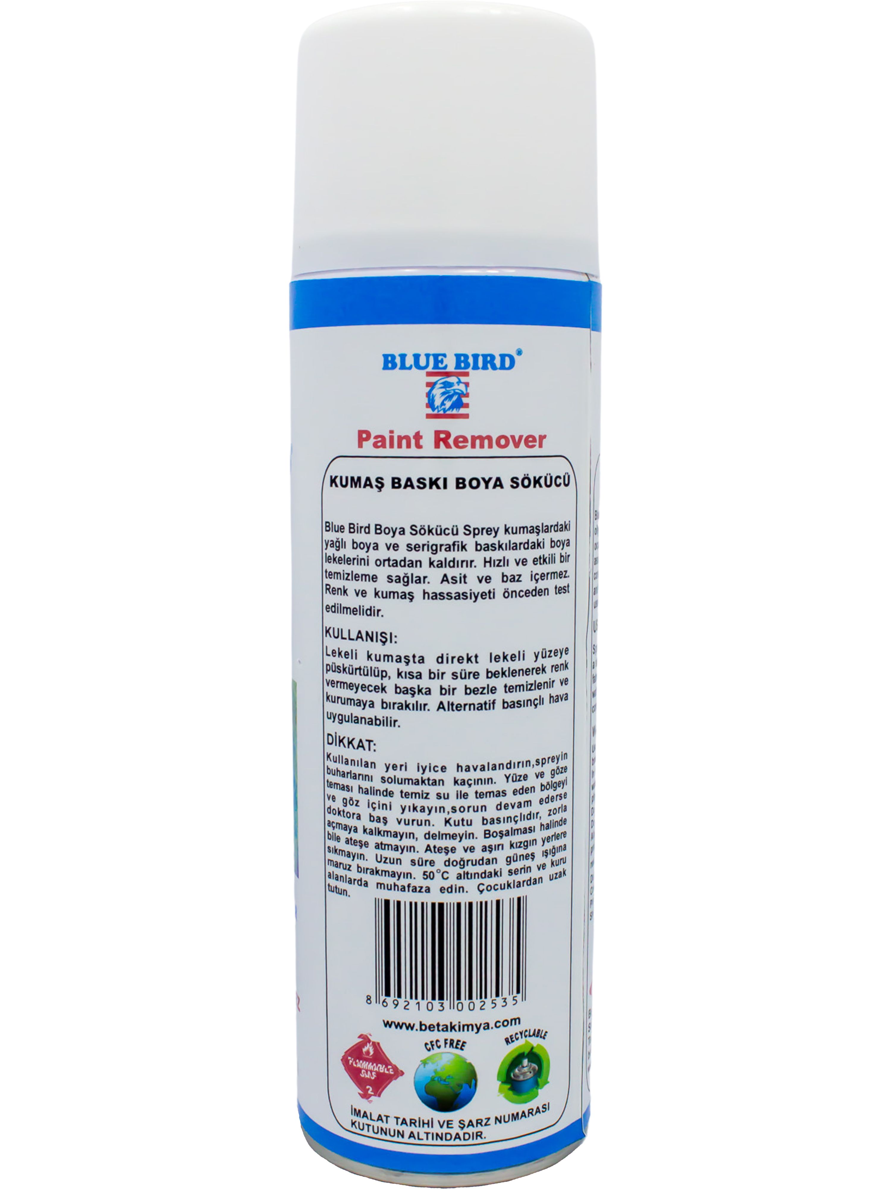 Blue Bird Boya Sökücü Sprey, kumaşlardaki yağlı boya ve serigrafik baskılardaki boya lekelerini ortadan kaldırır. Hızlı ve etkili bir temizlik sağlar. Asit ve baz içermez. Renk ve kumaş hassasiyeti önceden test edilmelidir.